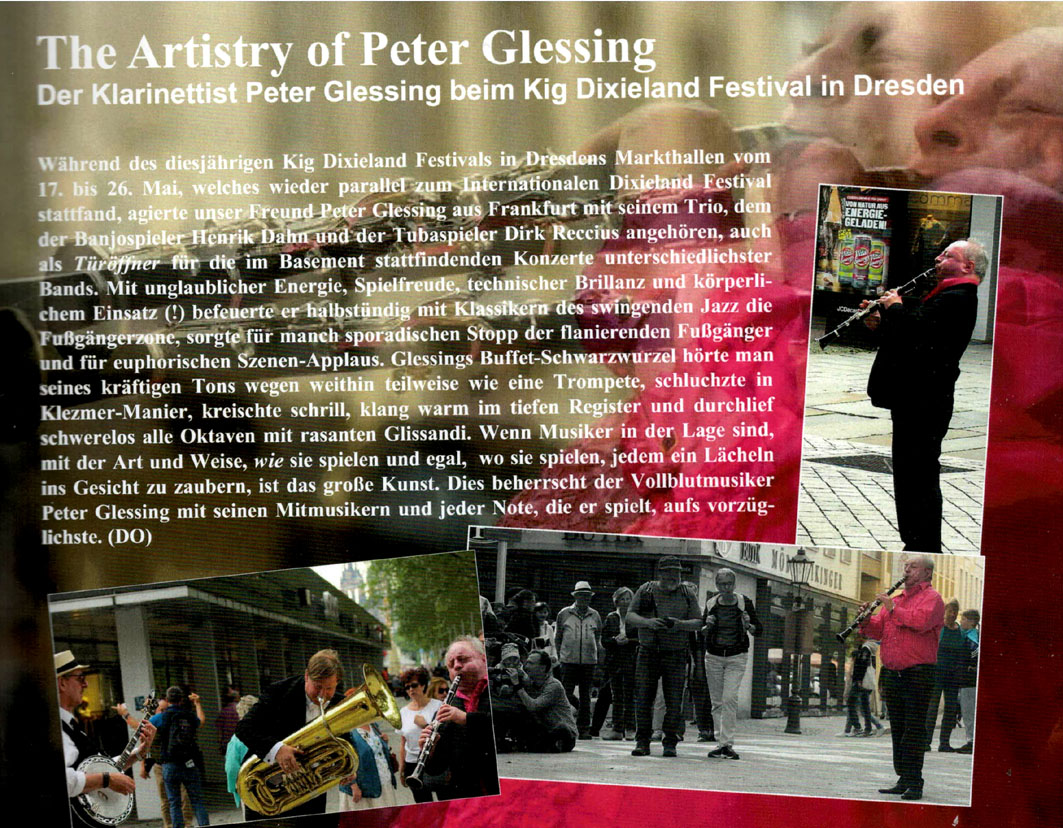 ... der unbestrittene Star jedoch war Peter Glessing an Saxophon und Klarinette. Sein atemberaubend brillanter Ton bei tragenden Blue-Notes und expressiven freien Ausbrüchen riss die Zuhörer hin.